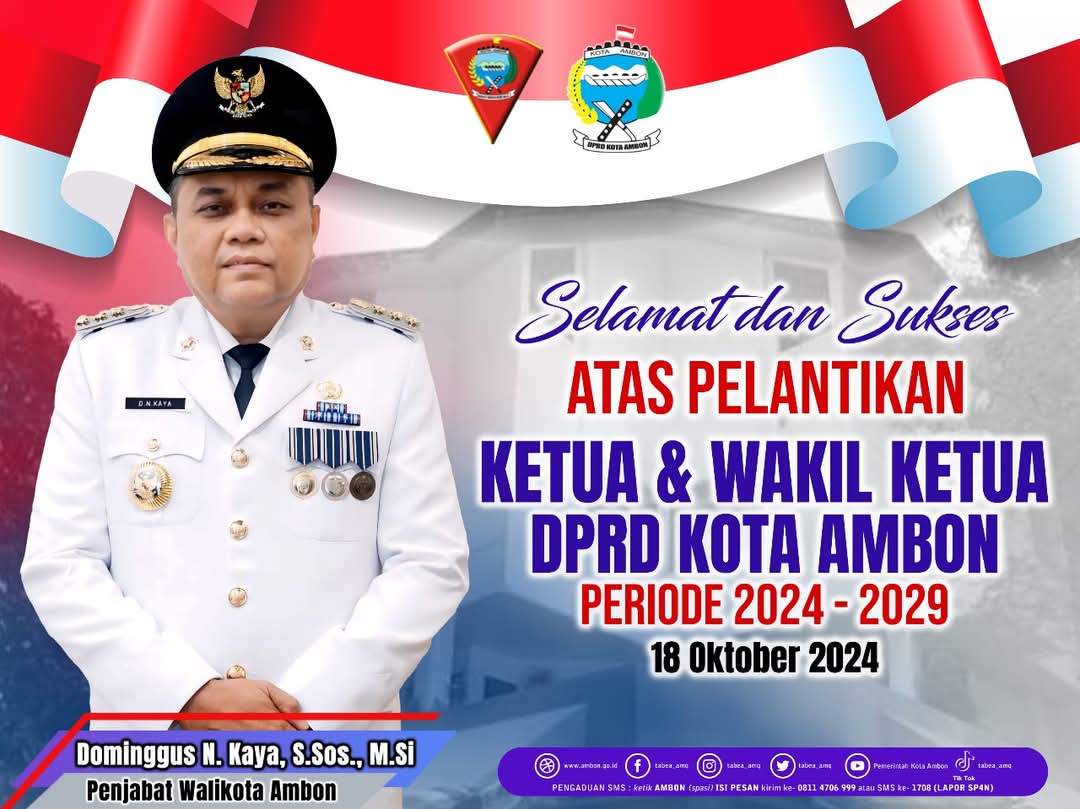 Oktober 10, 2024Desember 29, 2024oleh suarapaparisa Iklan Pemkot Ambon Pj Walikota Ambon Mengucapkan Selamat dan Sukses Pelantikan Ketua dan Wakil Ketua DPRD Kota Ambon Periode 2024 – 2029 suarapaparisa-Iklan- views Jangan LewatkanKomandan Satuan Pertahanan Pantai Kodaeral IX Letkol Laut (P) Frejohn da COSTA dan Ny. Anita da COSTA Mengucapkan SELAMAT HARI RAYA IDULFITRI 1447 H 1 Syawal 1447 Hijriah Taqabbalallahu Minna wa minkum Mohon Maaf Lahir BatinPemda Aru Mengucapkan Selamat Idul Fitri 1 Syawal 1447 HPemda Aru Mengucapkan Selamat Tahun Baru Imlek Tahun 2026KADIN Kabupaten Kepulauan Kep. Aru Mengucapkan Hari Santri Nasional Tahun 2025, 22 Oktober 2025