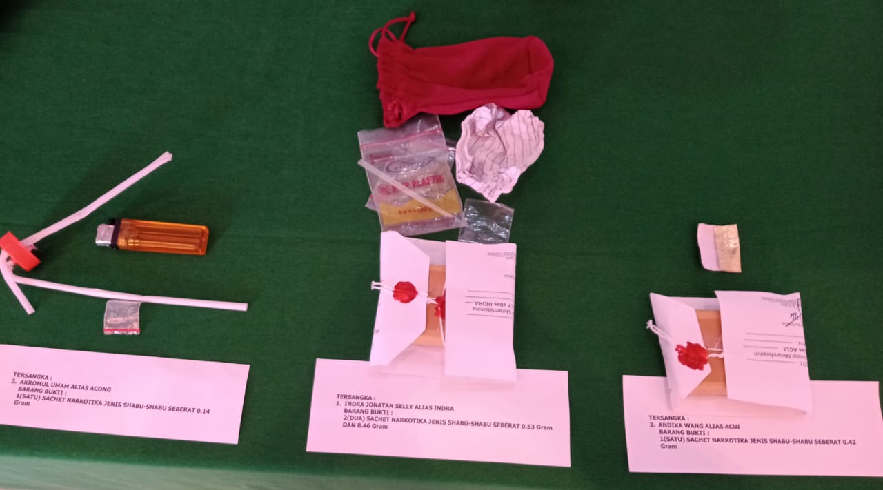 “IS ditangkap dengan jumlah barang bukti 2 bungkus sachet sabu-sabu, satu buah HP Samsung beserta SIM Card, AU ditangkap dengan barang bukti 1 sachet bungkus sabu-sabu, sementara TSK AW ketika di tangkap ditemukan 1 sachet sabu-sabu dan satu buah HP Nokia,” ujar Kapolres.