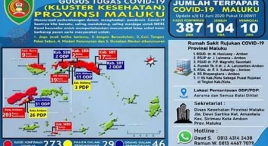 Ambon, SP. Com. Jumat, 12/06/2020. Data Gugus tugas Covid-19 Provinsi Maluku pasien terkonfirmasi positif Covid-19 dari 330 kasus bertambah menjadi 387 kasus.